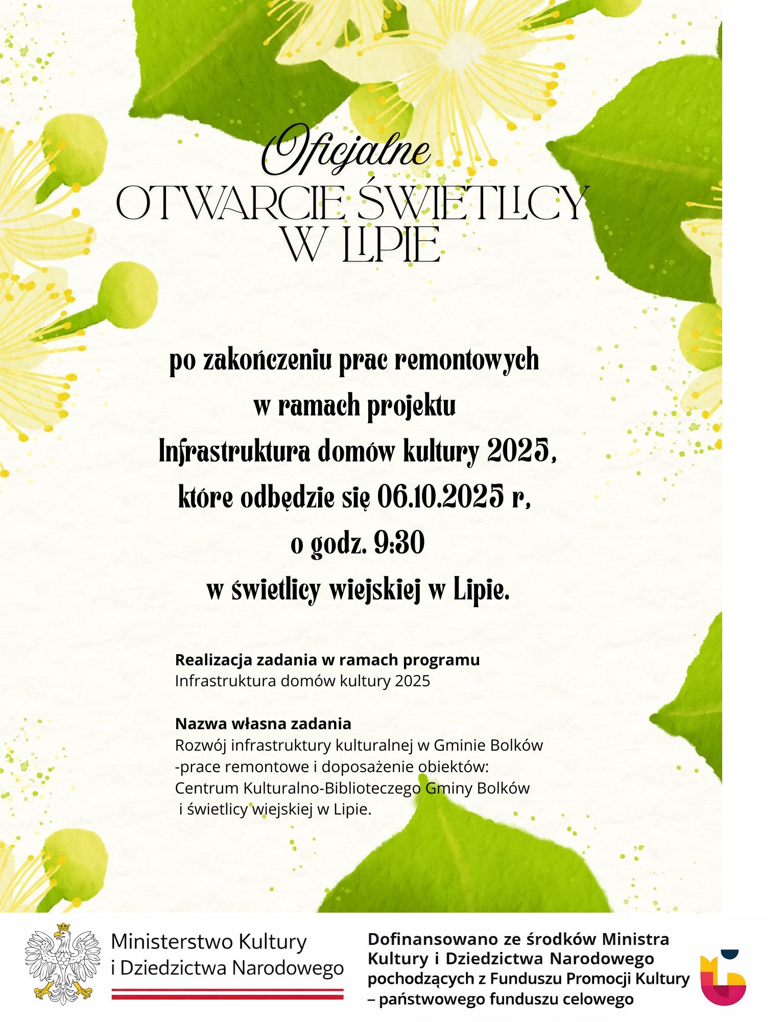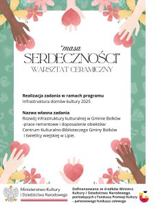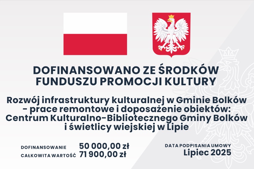 Zakończyła się realizacja projektu, którego celem było wzmocnienie infrastruktury kulturalnej oraz poprawa warunków do prowadzenia działań artystycznych i edukacyjnych na terenie Gminy Bolków. Dzięki przeprowadzonym pracom remontowym oraz zakupowi nowego wyposażenia Centrum Kulturalno-Biblioteczne Gminy Bolków oraz świetlica wiejska w Lipie zyskały nową jakość i funkcjonalność.